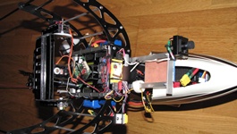 Kilka prób z gimbalem wieszanym na nosie Heli 550 mam już za sobą. Niestety poziom wibracji w Heli jest na tyle duży i zmienny iż trudno zbudować dobrze tłumiące drgania zawieszenie kamery.