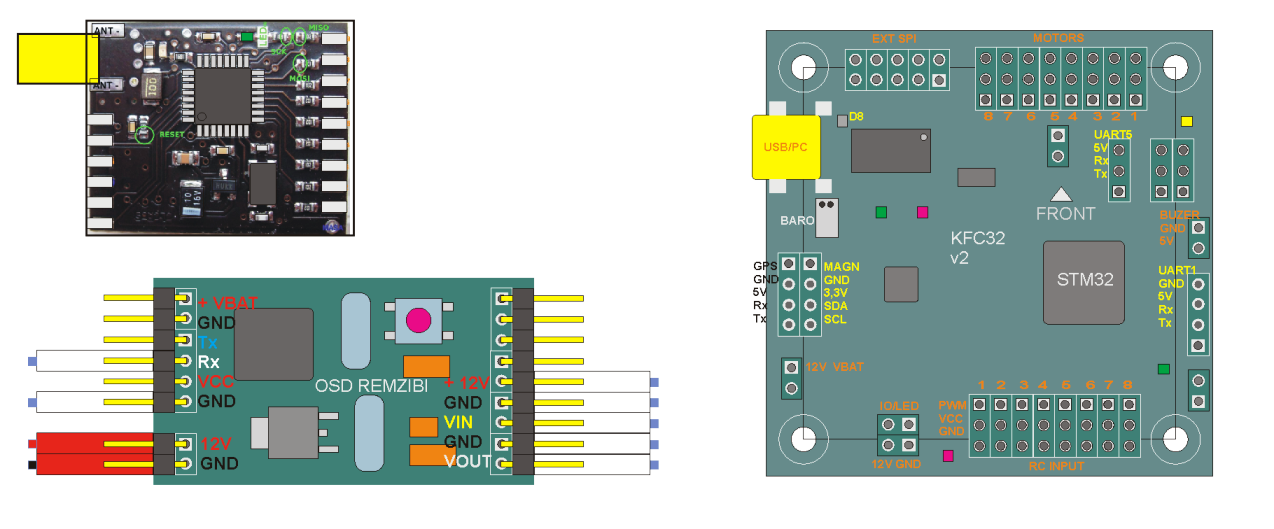 Wszystkie pozostałe złącza nie podpięte, w tej konfiguracji nie są używane. Odbiornik RC jest zintegrowany na module OSD. Płytka FC KFC32 jest zasilana 5V poprzez złącze SPI z modułu OSD.