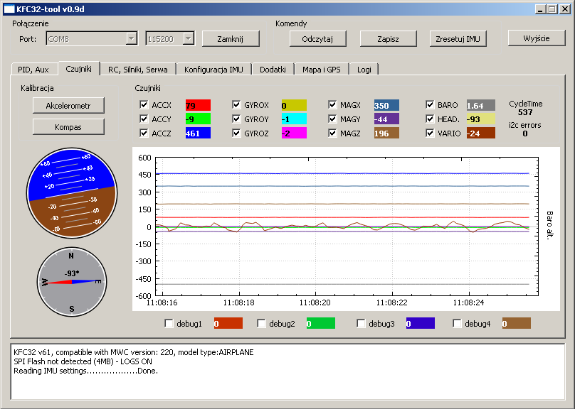 - ACC+BARO - utrzymywanie wysokości względem czujnika ciśnienia atmosferycznego oraz automatyczna stabilizacja modelu, automatyczne sterowanie ciągiem (manetka gazu)
