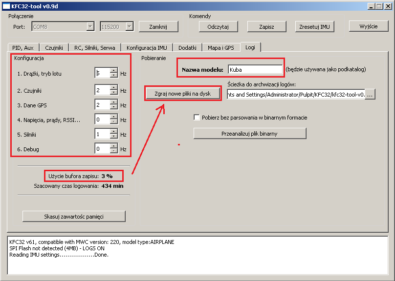 Zawartość pliku logów możemy odczytać w notatniku lub w arkuszu Excela. Na tej podstawie możemy rysowac np. wykres wysokości i nastaw sterów + odczyty czujników. Możliwosci analizy są ogromne.