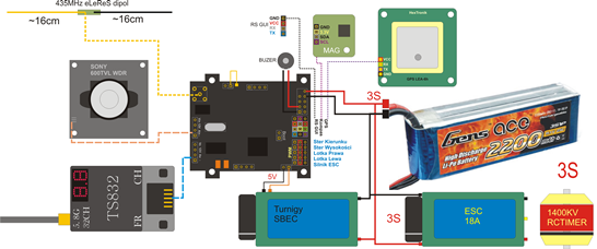 - antena eLeReS znajduje się blisko kamery video, w tym przypadku jest to dopuszczalne gdyż wyłączyłem w KFC32 funckję nadawania telemetrii, antena więc jest tylko odbiornikiem i nie będzie zakłócać obrazu Video.