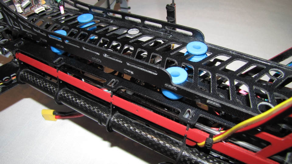 Czerwony gimbal założóny na pokład Q7 Transportera. Do zamocowania testowanych gimbali użyłem zapasowe ramiona ALU z innego quadro, bardzo lekkie - ażurowane- a jednocześnie sztywne. Całość zamocowana na sztywno do pokrywy elektroniki w Q7, funkcję wibroizolatorów pełnią jedynie dumpery w testowanym gimbalu.