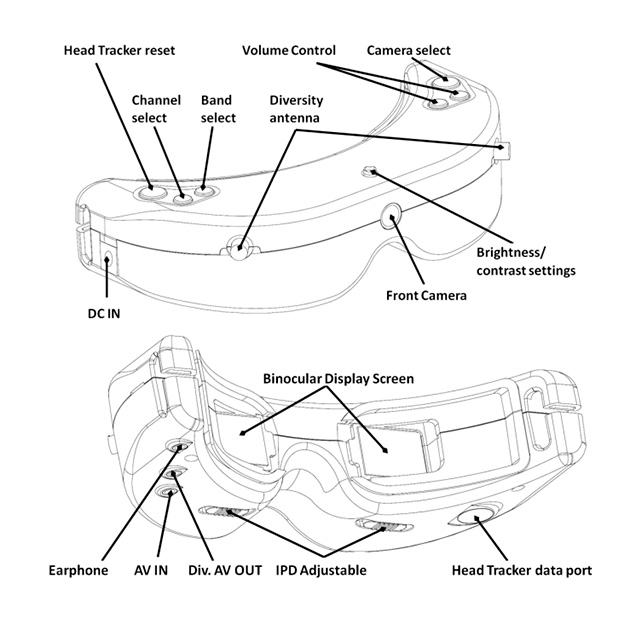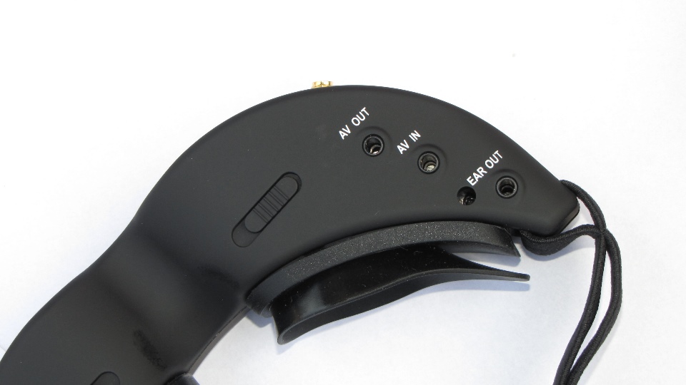 Pod spodem goggli zauważymy podłużne klawisze - regulację rozstawu monitorów LCD. Bardzo pomocna i przydatna funkcja, której niestety zabrakło w fatsharkach serii dominator. Najwidoczniej Chinczycy uznali iż wszyscy mają takie same skośne oczka. Po bokach znajdują się gniazda rozszerzeń i wyjść, z lewej na system trackera, z prawej złącza AV.