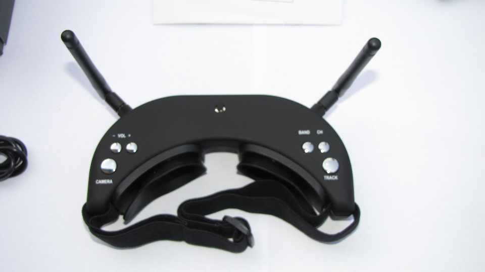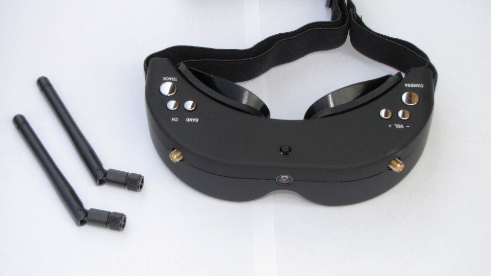 Poniżej zdjęcia goggli. Po wyjęciu z pudełka dokładnie obejrzałem goggle z każdej strony. Nie odniosłem wrażenia iż trzymam odpustową zabawkę, no może poza srebrnymi klawiszami ;) te jednak działają precyzyjnie. Materiał z którego są wykonane sprawia wrażenie solidnego. Z obu stron widzimy gniazda SMA na anteny, które dołączone są w komplecie z innymi akcesoriami. Wbudowany system diversity na 5.8GHz wybiera zawsze najsliniejszy sygnał. Gogle zaraz po włączeniu sygnalizują dzwiękowo tryb pracy w jakim się znajdują (kanał).