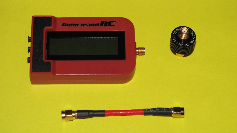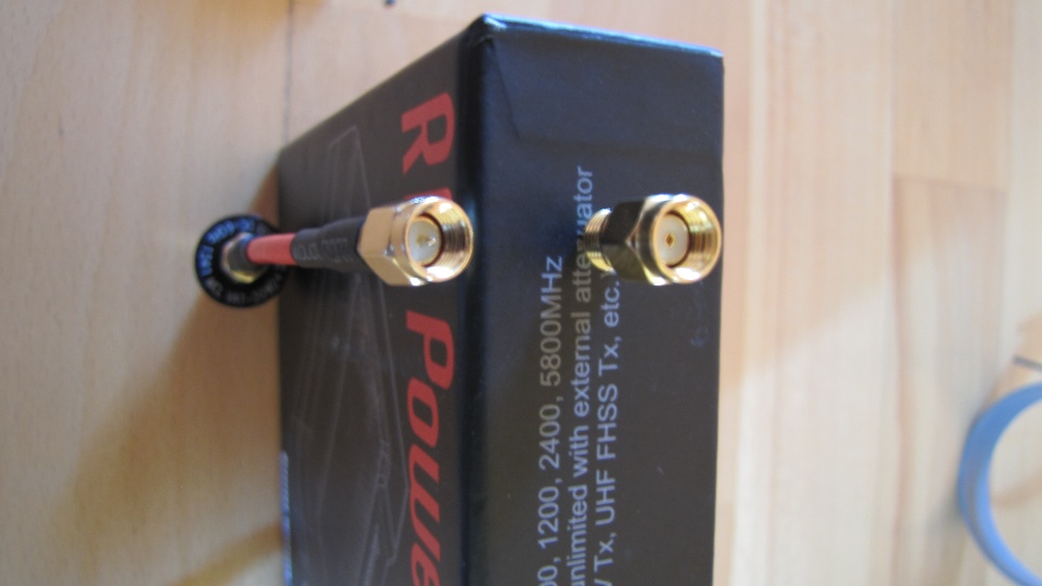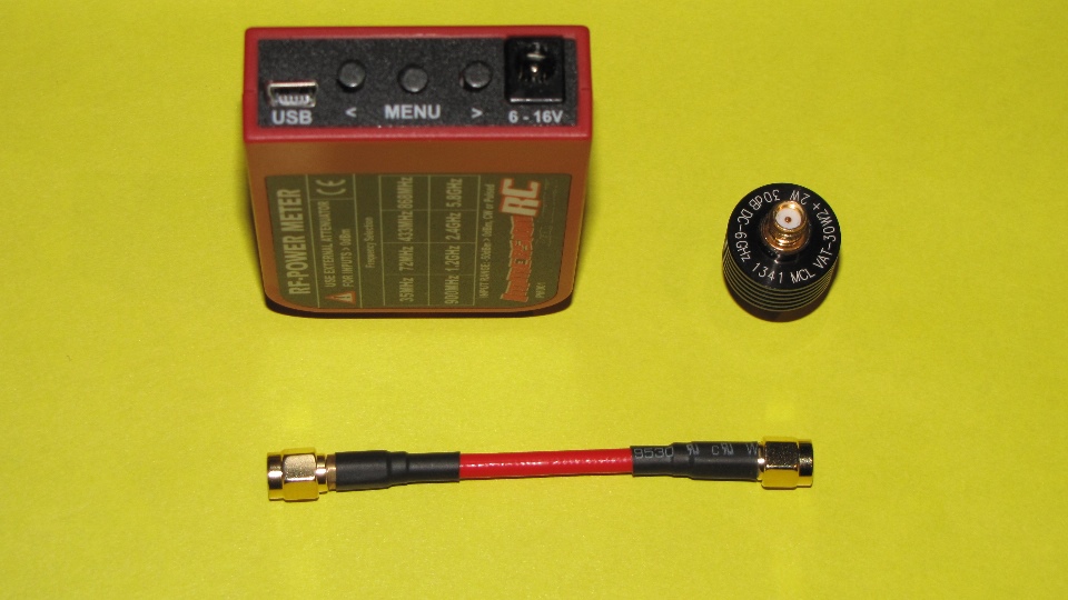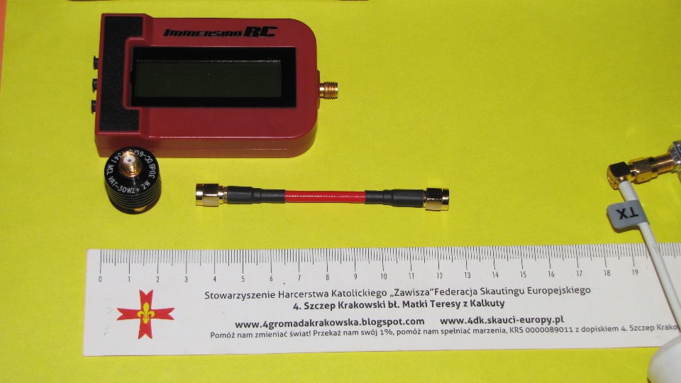 Podpinamy do miernika kolejno: tłumik, przewód dystansowy, przelotkę SMA-RPSMA (brak w zestawie), badany nadajnik AV Boscam.