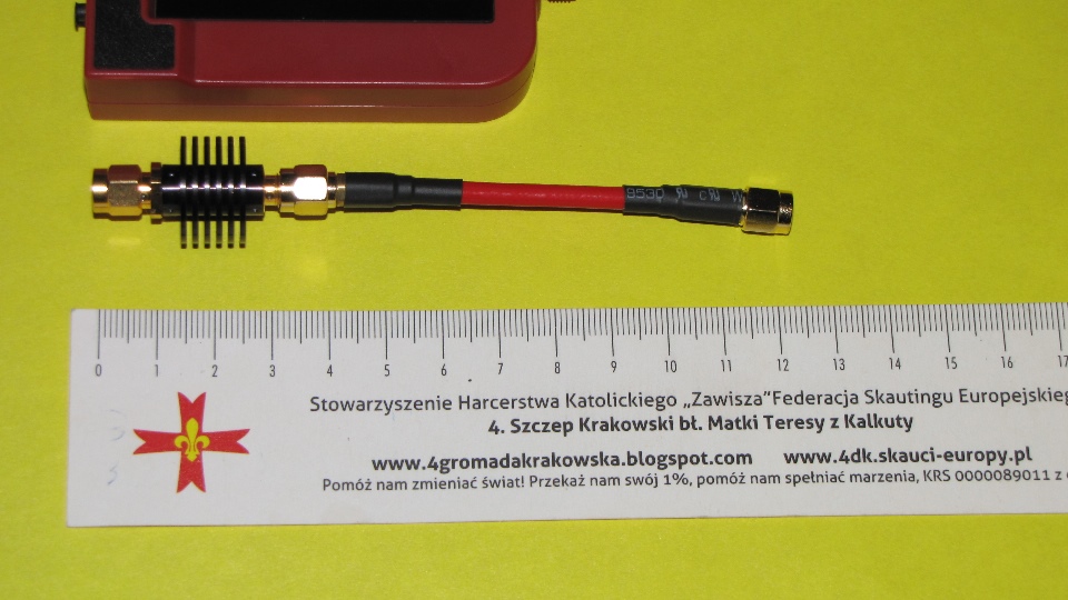 W celu podłączenia miernika z dołączonym tłumikiem do nadajnika, powinniśmy użyć bardzo krótki odcinek kabla koncentrycznego, z męskim SMA na każdym końcu, lub krótki adapter. Odpowiedni przewód półsztywny jest dołączony do miernika mocy RF.