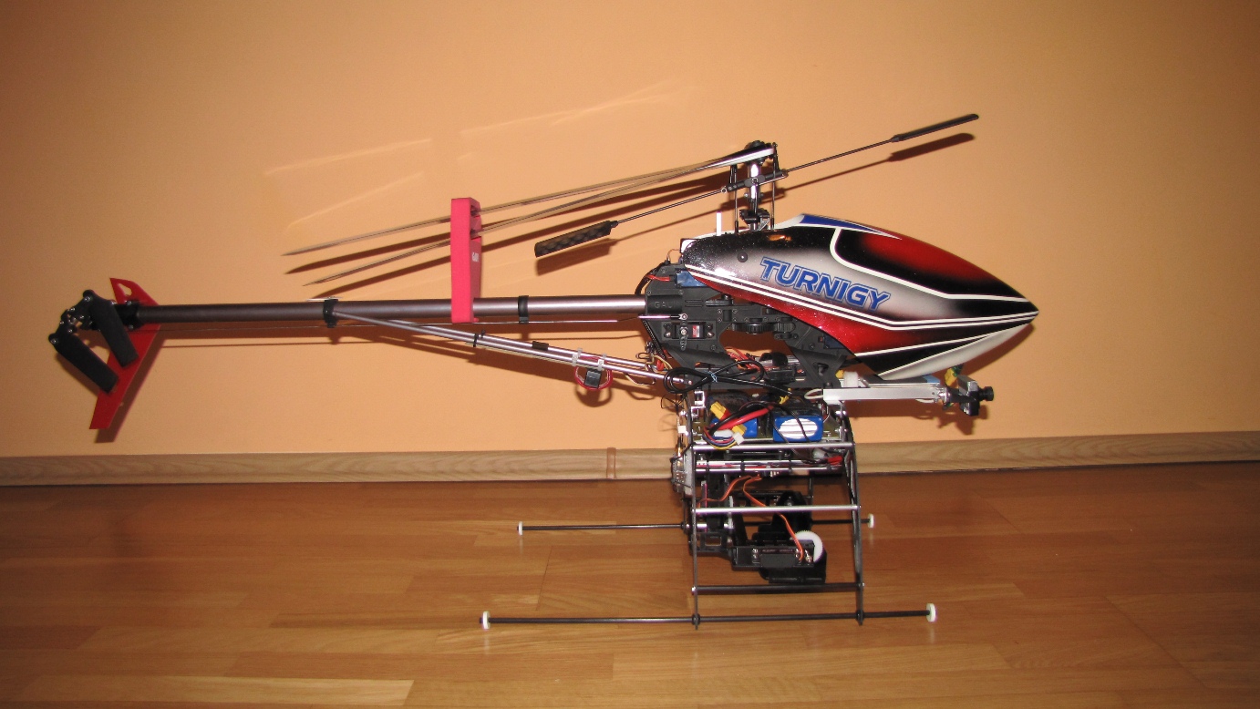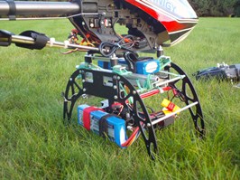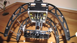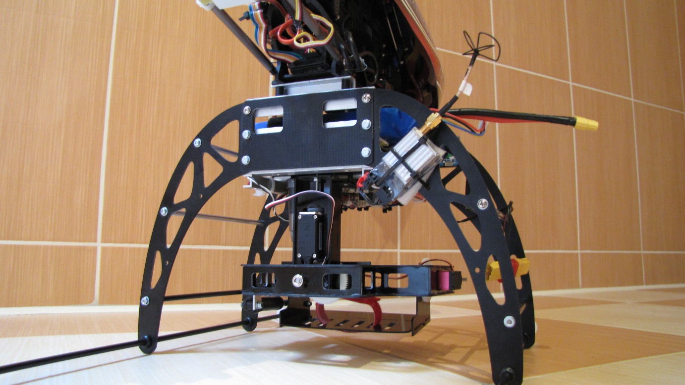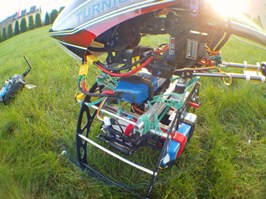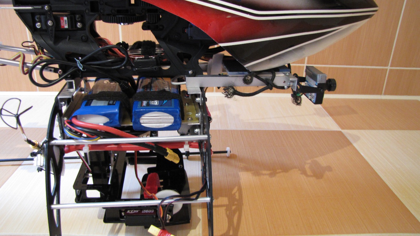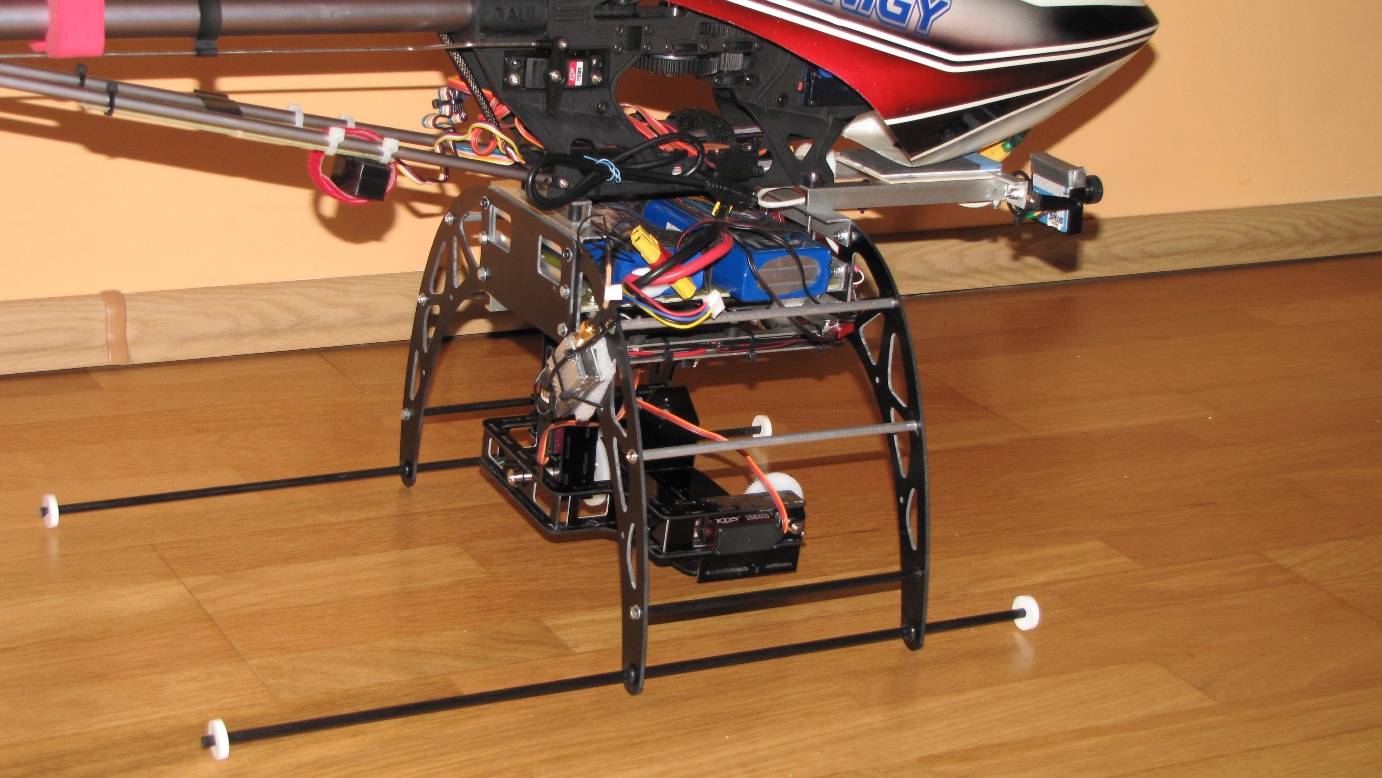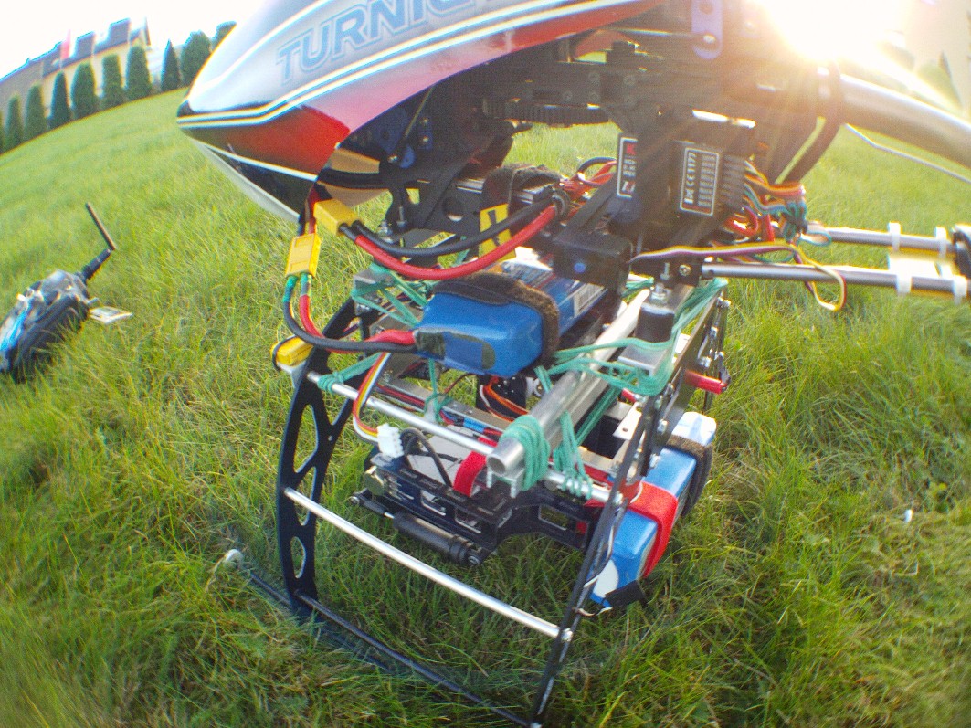 Kilka prób z gimbalem wieszanym na nosie Heli 550 mam już za sobą. Niestety poziom wibracji w Heli jest na tyle duży i zmienny iż trudno zbudować dobrze tłumiące drgania zawieszenie kamery.