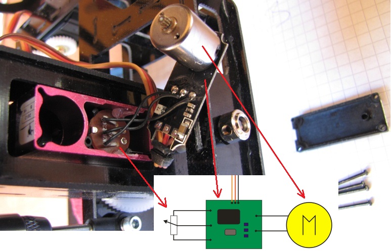 Zmniejszając w ten sposób rezystancję odczytywaną przez układ sterujący powodujemy zwiększenie wychyleń serwa.