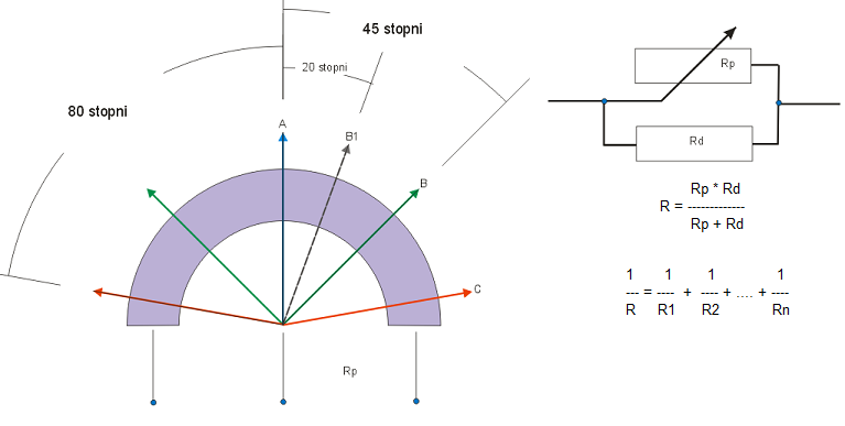 Tak więc w efekcie sterownik (z potpiętym rezystorem Rd do potencjometru) osiągając punkt B = 45 stopniom stwierdzi iż osiągnął punkt B1~1,5k ohm a nie 5k ohm.