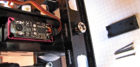 4. w środku obudowy jest wystarczająco dużo miejsca aby zastosować rezystory w standardowej obudowie. Na płytce jest też miejsce na rezystory SMD. Pomiędzy końcówki potencjometru wlutujemy rezystorki 2k ohm. Uwaga rezystancja oporników może być inna w zalezności od typu serwa.