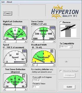 Mechanicznie serwo może wychylić się w granicach ~ 160-170 stopni, jednak sterownik ma zaprogramowany przedział rezystancji dla jakiej wysterowuje ruch serwa. Zazwyczaj jest on ograniczony w taki sposób aby pracować w zakresie 90 stopni. Mozna to zmienić za pomocą:
