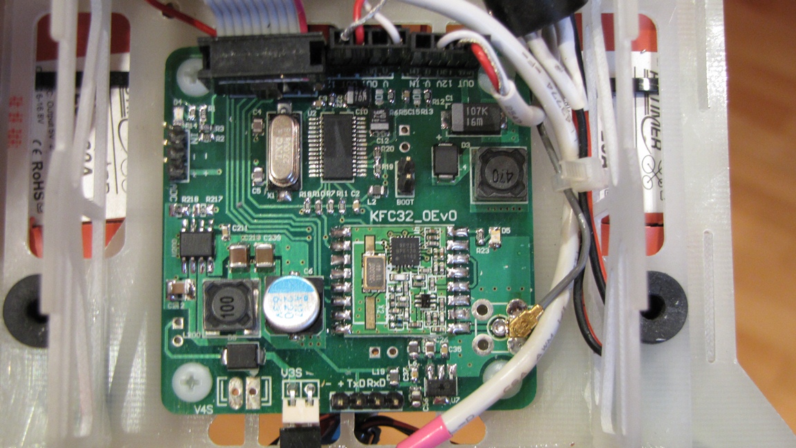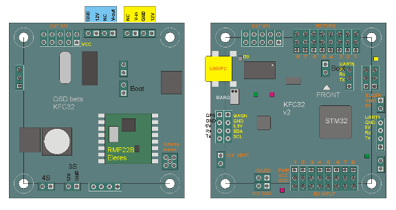 3. Odbiornik RC Eleres - a dokładnie moduł radiowy RMF22. Moduł jest sterowany poprzez złącze SPI bezpośrednio przez firmware FC KFC32. Otrzymujemy m.in. zatem informacje na temat poziomu sygnału RC RSSI w postaci cyfrowej. Konfiguracja odbiornika rc eleres odbywa się w konsoli FC.