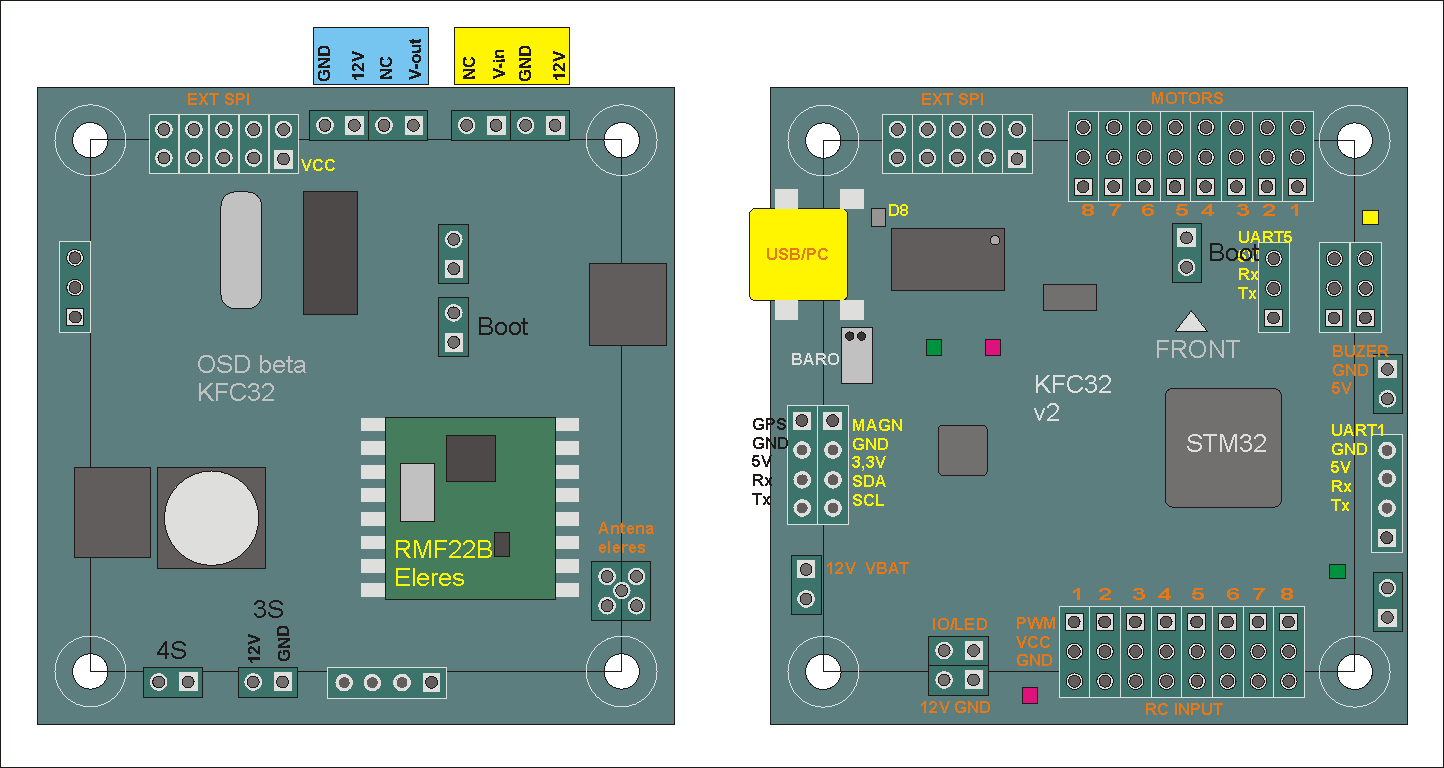 Rysunek poglądowy z opisem wyprowadzeń: z lewej płytka OSD, z prawej płytka FC KFC32 :