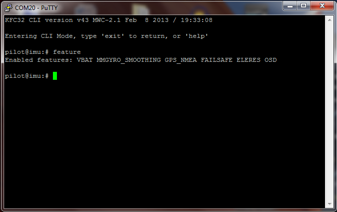 Poniżej ekran z konsolą KFC32, wyświetlona wersja beta firmware oraz wylistowane opcje feature. Jak widać KFC32 posiada również obsługę modułu eleres.