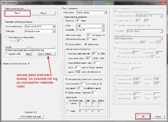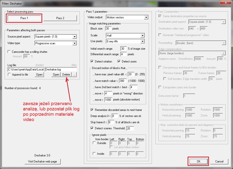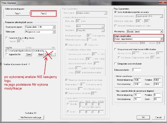 ■ W konfiguracji filtru Deshaker zaznacz "Pass 1", pamiętaj aby zawsze skasować plik LOG analizy przed pierwszym wykonaniem analizy, ustaw poniższe wartości :