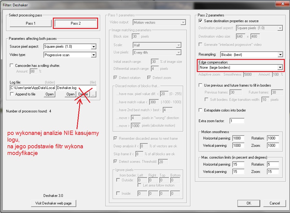 ■ Po wykonanej analizie. W konfiguracji filtru Deshaker zaznacz "Pass 2", w opcji "Edge Compensation" możesz ustawić czy ramki będą widoczne.
