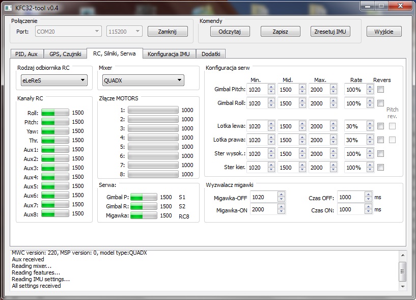 GUI - konfiguracja serw jest "na zywo" czili jak zmieniamy to ładnie pokazuje to na lotkach, ale zapis do eepromu na koniec trzeba pamiętac aby to zrobić