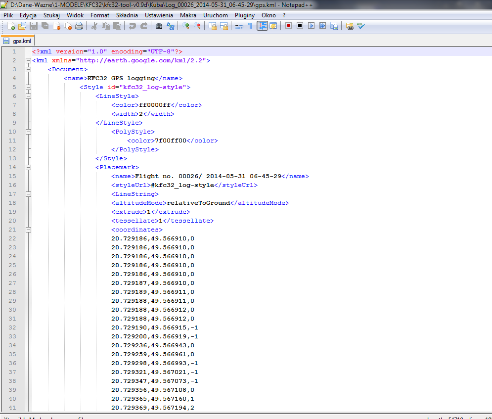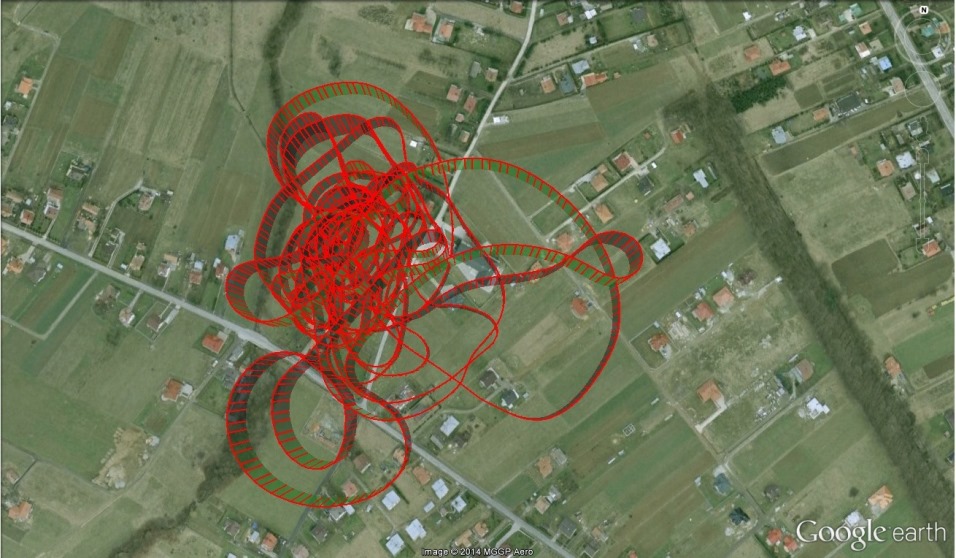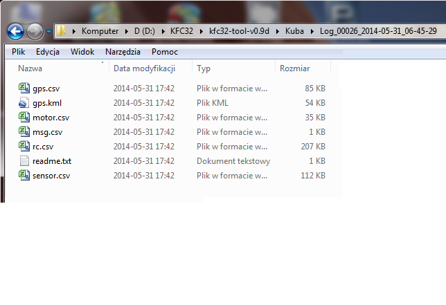 - gps.kml - plik z zapisem trasy lotu, wysokości i położenie w formacie dla Google Earth, po wczytaniu otrzymamy wizualizacje trasy lotu na mapie.