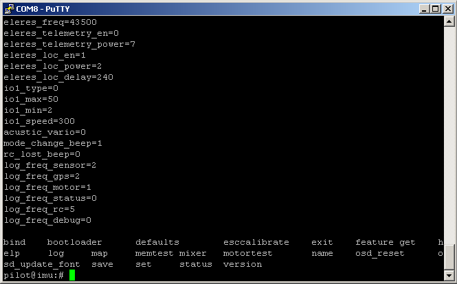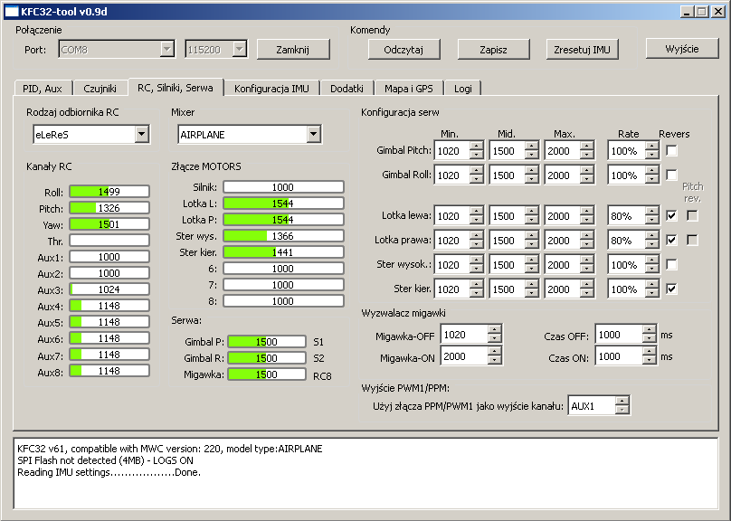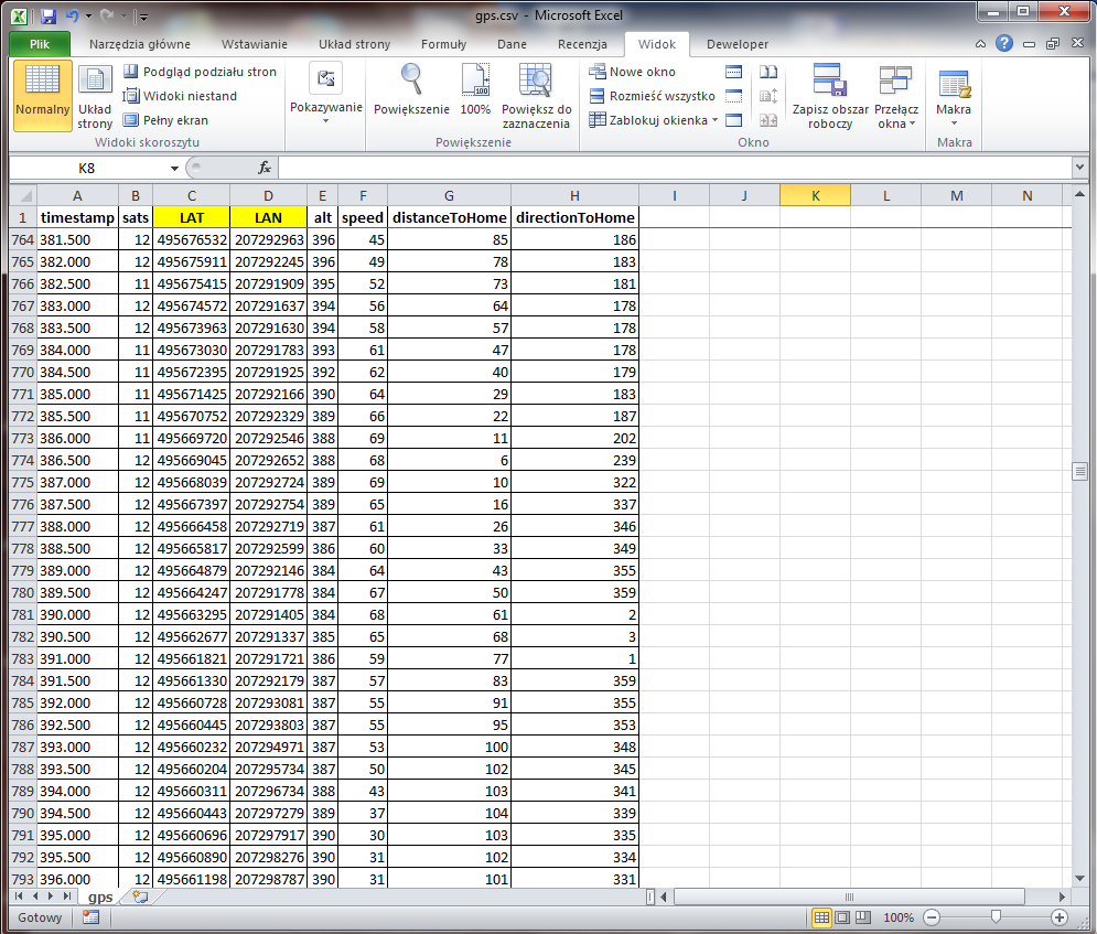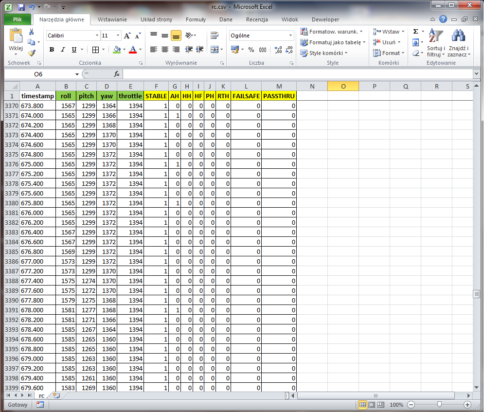 - rc.csv - plik zawiera odczyty poleceń pilota z aparatury RC, wychylenia drążków oraz tryby lotu aktywowane z aparatury (STAB, GPS HOLD itp.)