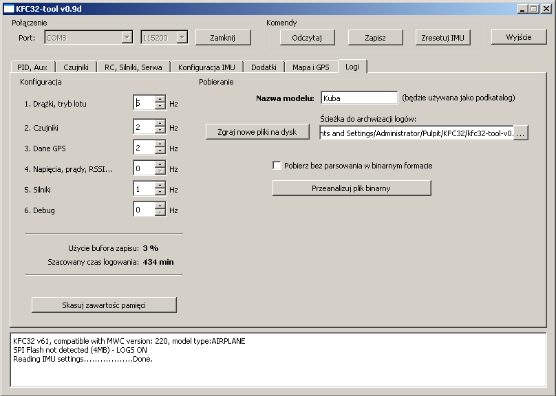 Zawartość pliku logów możemy odczytać w notatniku lub w arkuszu Excela. Na tej podstawie możemy rysowac np. wykres wysokości i nastaw sterów + odczyty czujników. Możliwosci analizy są ogromne.