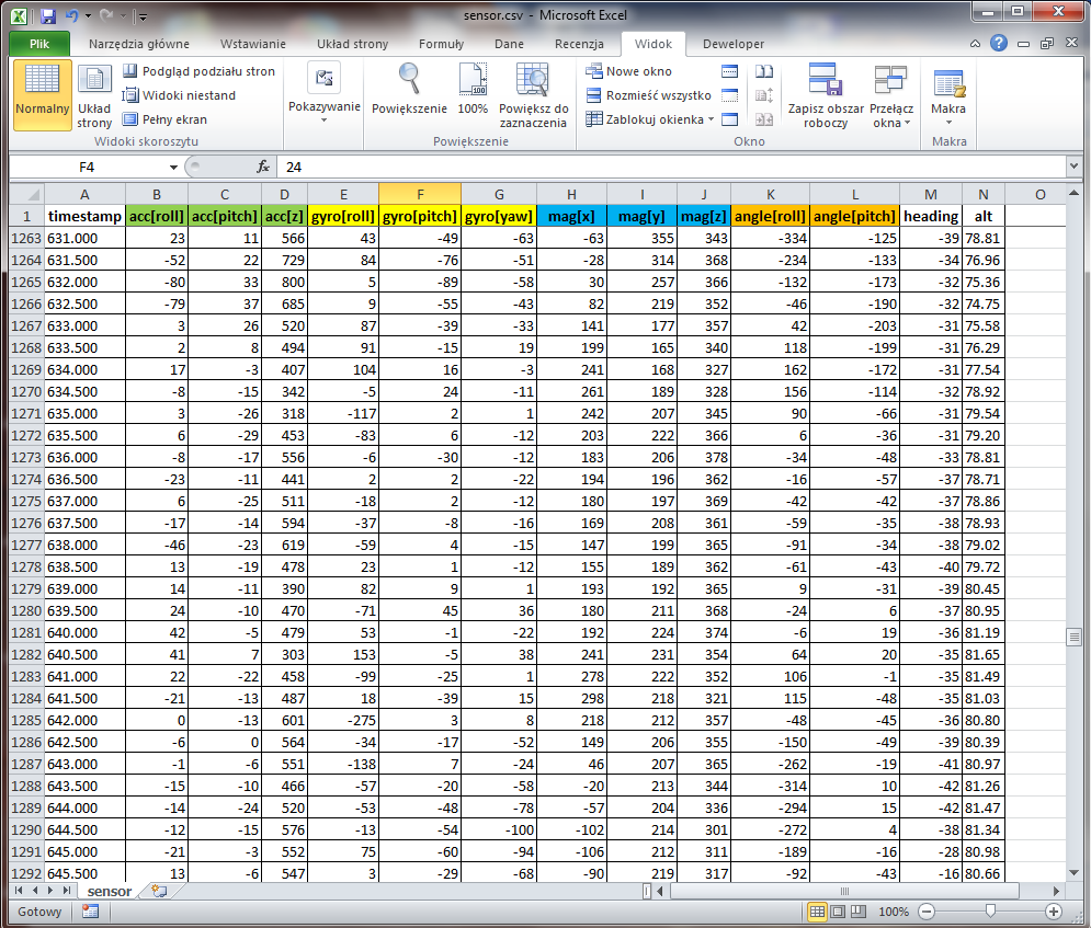 - sensor.csv - odczyty czujników ACC, GYRO, MAG, BARO...