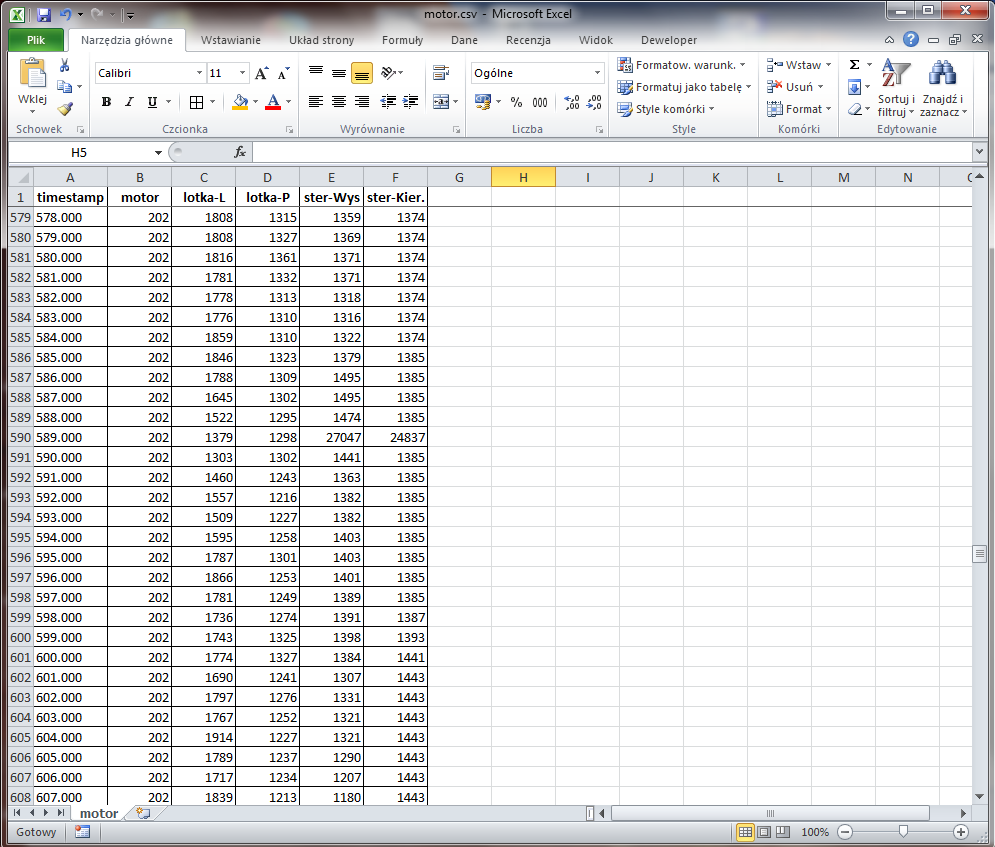 - motor.csv - plik zawiera nastawy sterów (wychylenia) oraz zapis pracy silników.