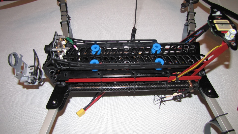 - standardowy układ na płasko z wibroizolatorami pomiędzy modelema a półką z pakietem i gimbalem ( niebieskie gumki)