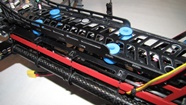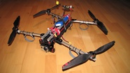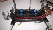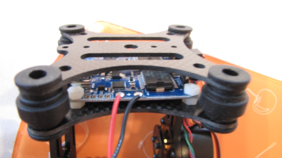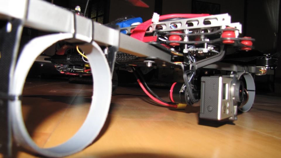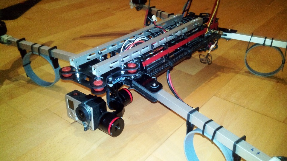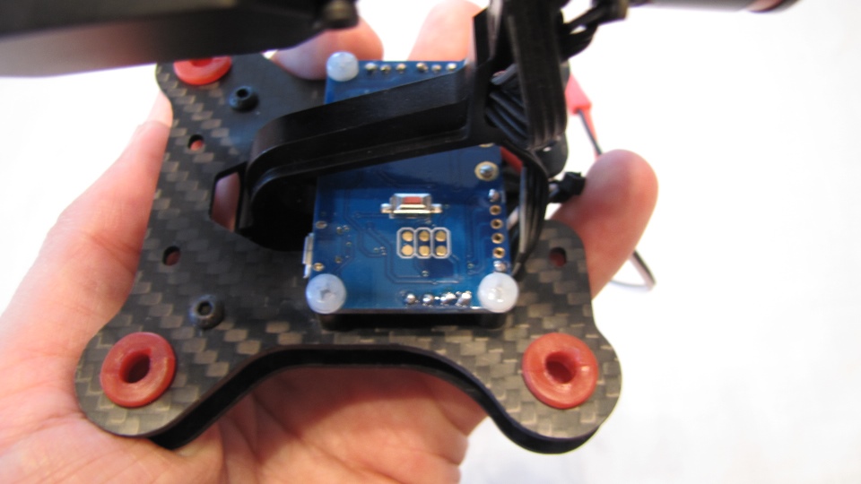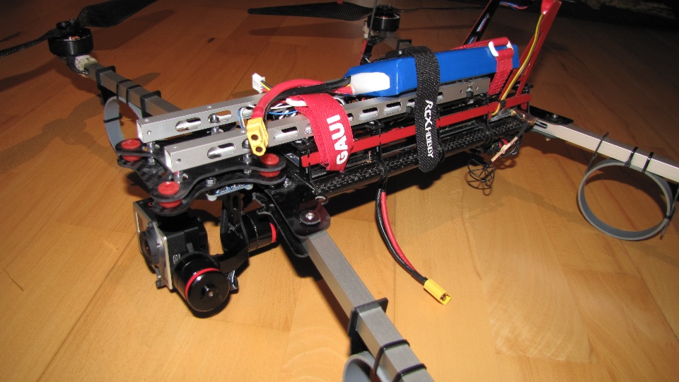 Czerwony gimbal założóny na pokład Q7 Transportera. Do zamocowania testowanych gimbali użyłem zapasowe ramiona ALU z innego quadro, bardzo lekkie - ażurowane- a jednocześnie sztywne. Całość zamocowana na sztywno do pokrywy elektroniki w Q7, funkcję wibroizolatorów pełnią jedynie dumpery w testowanym gimbalu.