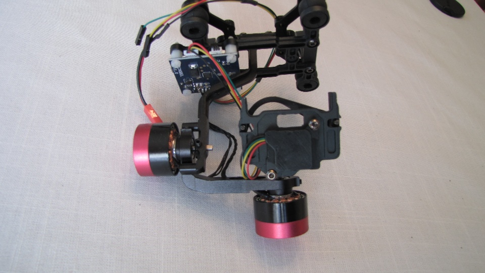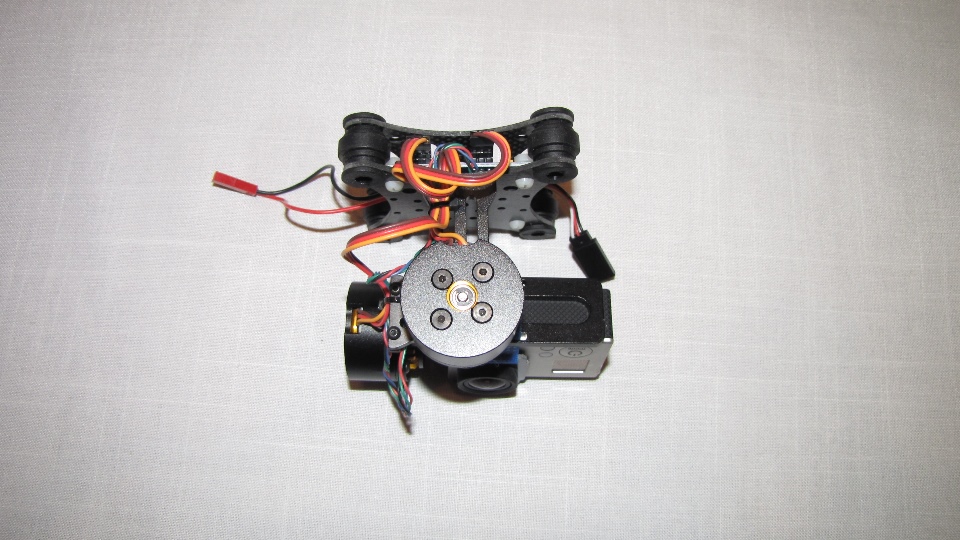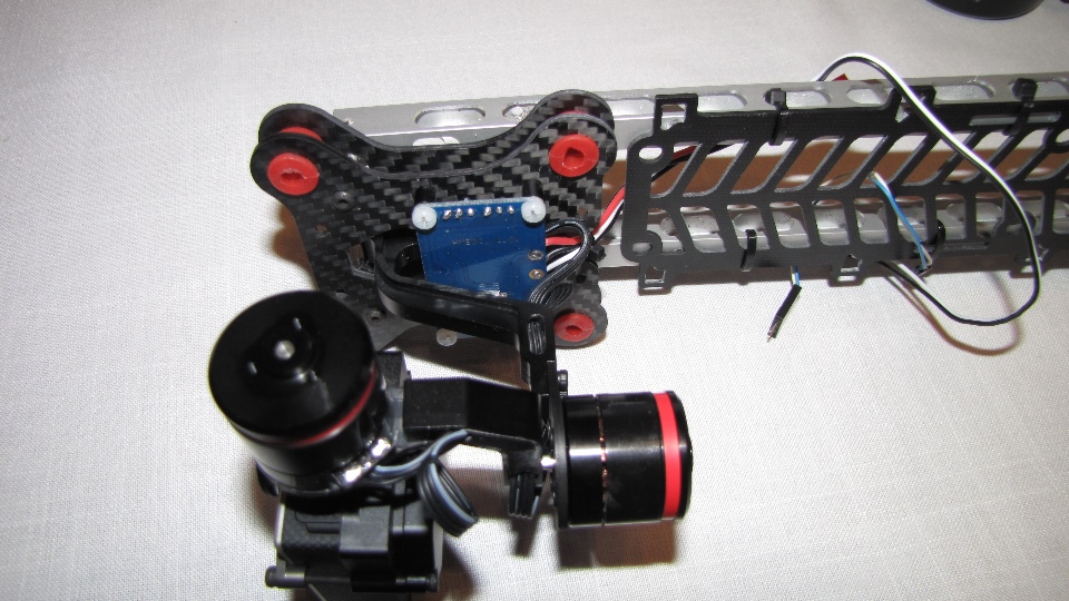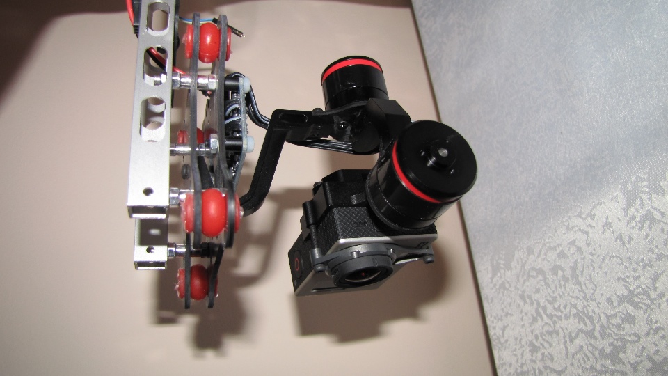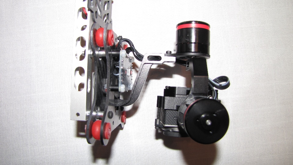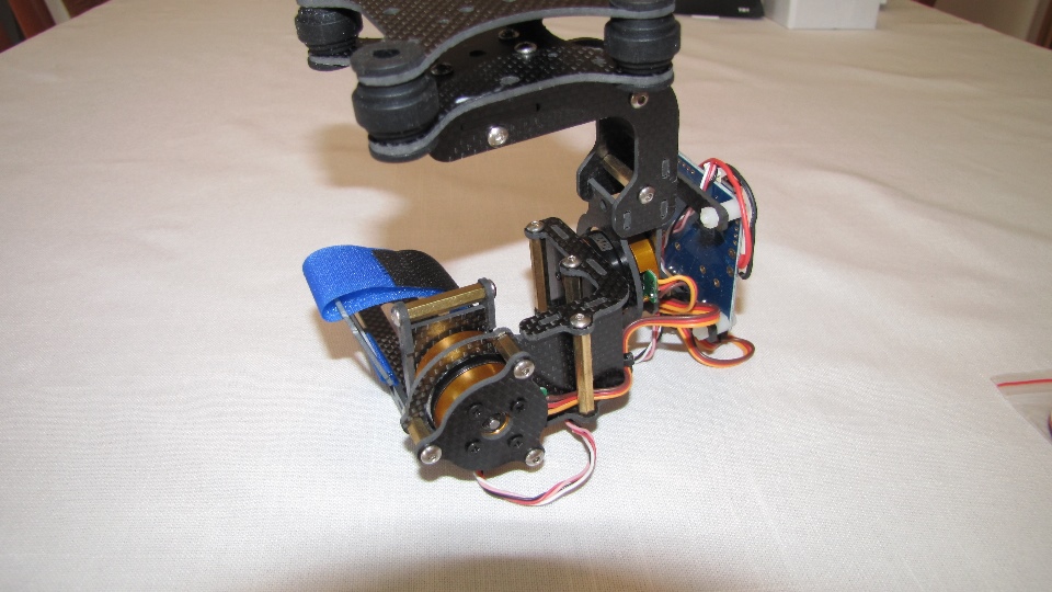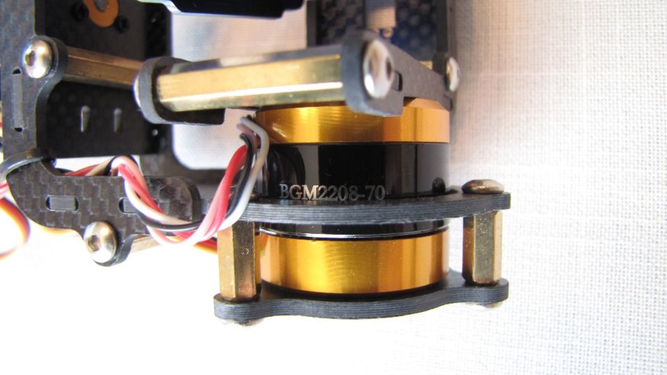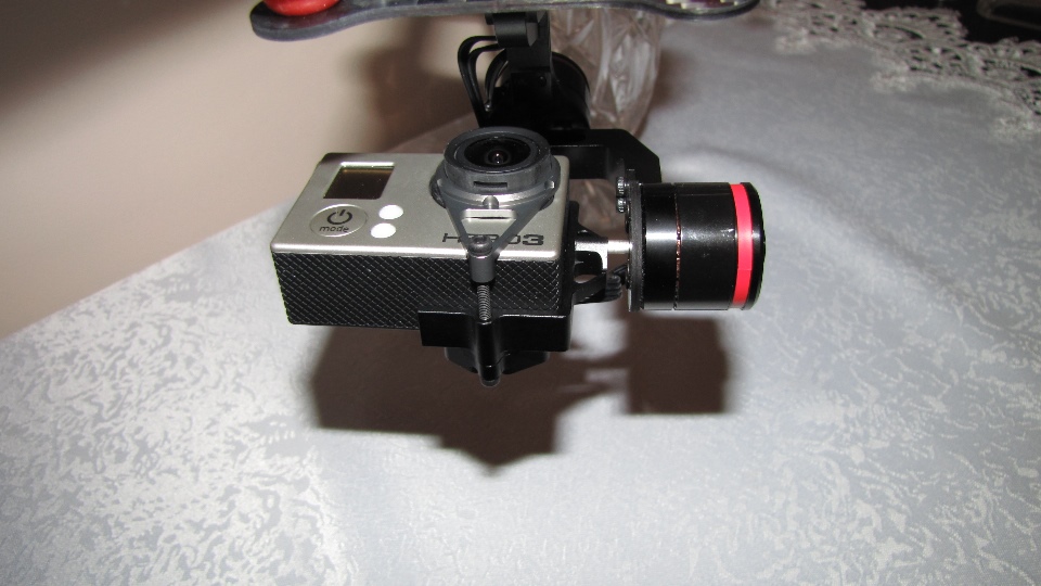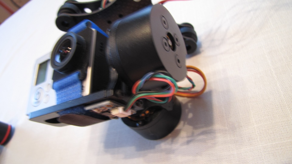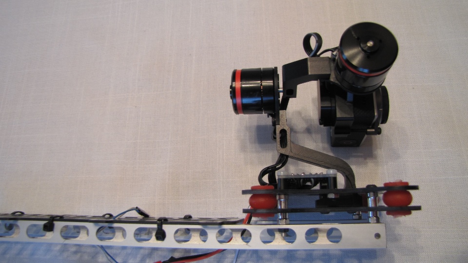 Poniżej zdjecia testowanego gimbala. Mocowanie jak w gimbali "Czerwonym" do profili aluminiowych na kadłubie Q7.