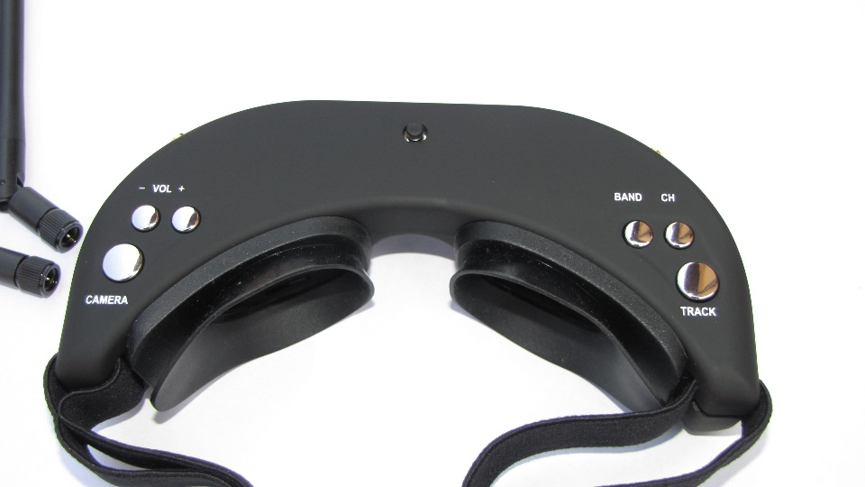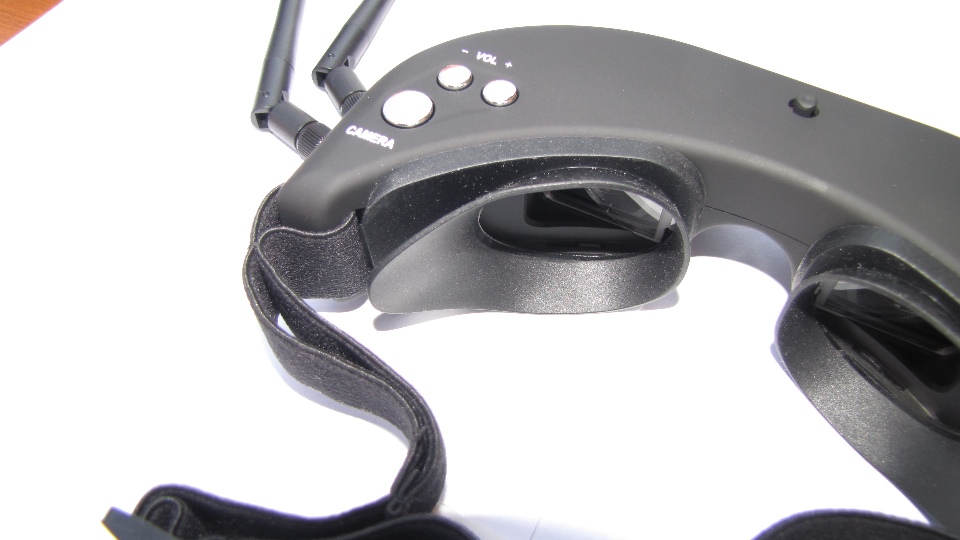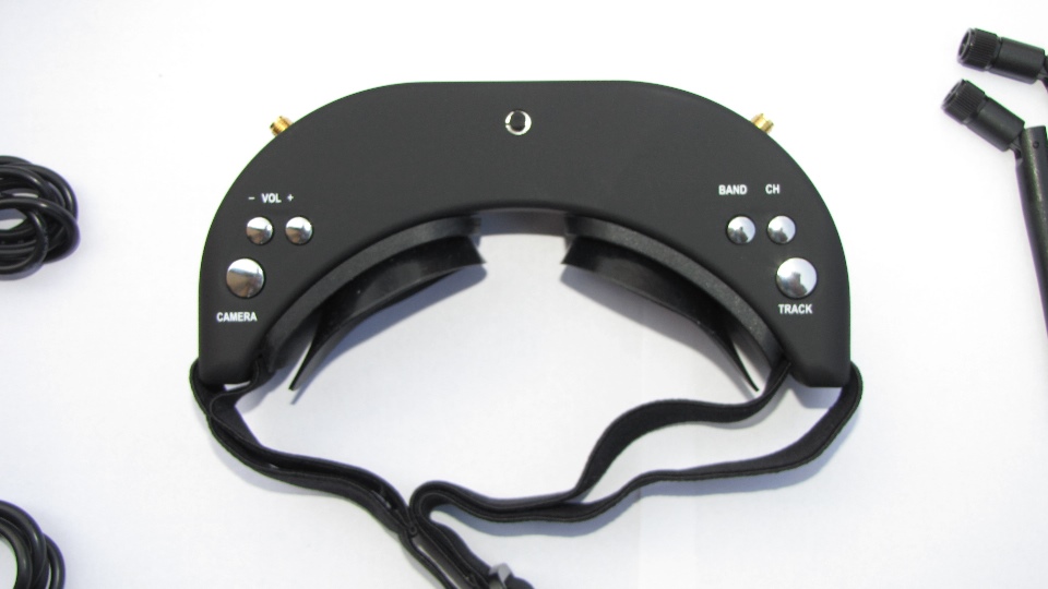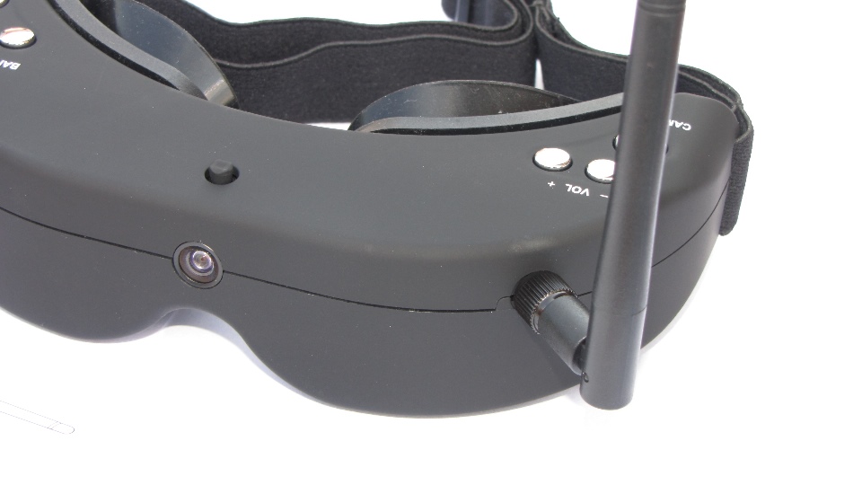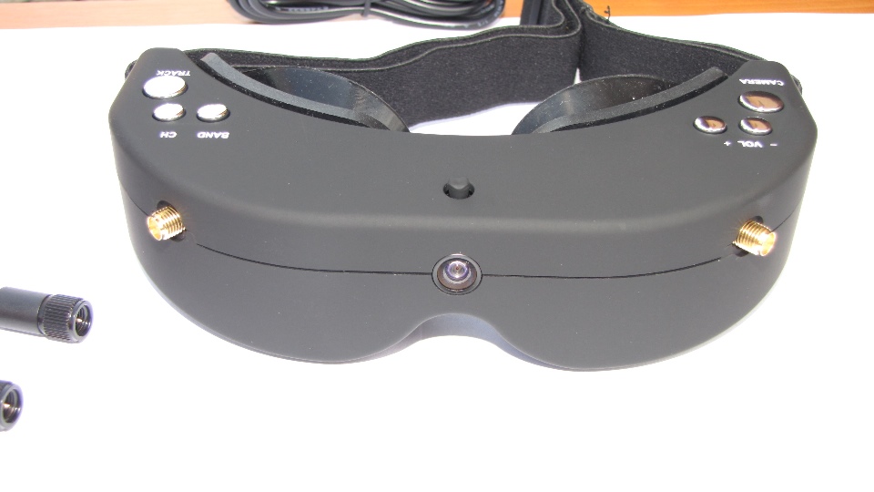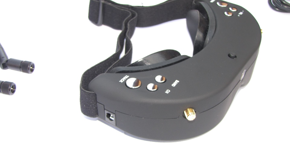 Poniżej zdjęcia goggli. Po wyjęciu z pudełka dokładnie obejrzałem goggle z każdej strony. Nie odniosłem wrażenia iż trzymam odpustową zabawkę, no może poza srebrnymi klawiszami ;) te jednak działają precyzyjnie. Materiał z którego są wykonane sprawia wrażenie solidnego. Z obu stron widzimy gniazda SMA na anteny, które dołączone są w komplecie z innymi akcesoriami. Wbudowany system diversity na 5.8GHz wybiera zawsze najsliniejszy sygnał. Gogle zaraz po włączeniu sygnalizują dzwiękowo tryb pracy w jakim się znajdują (kanał).