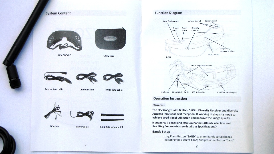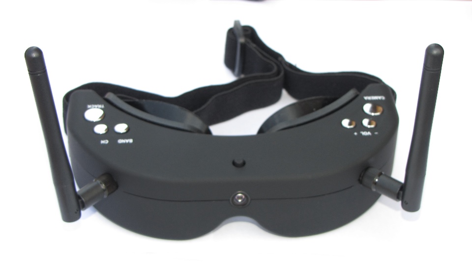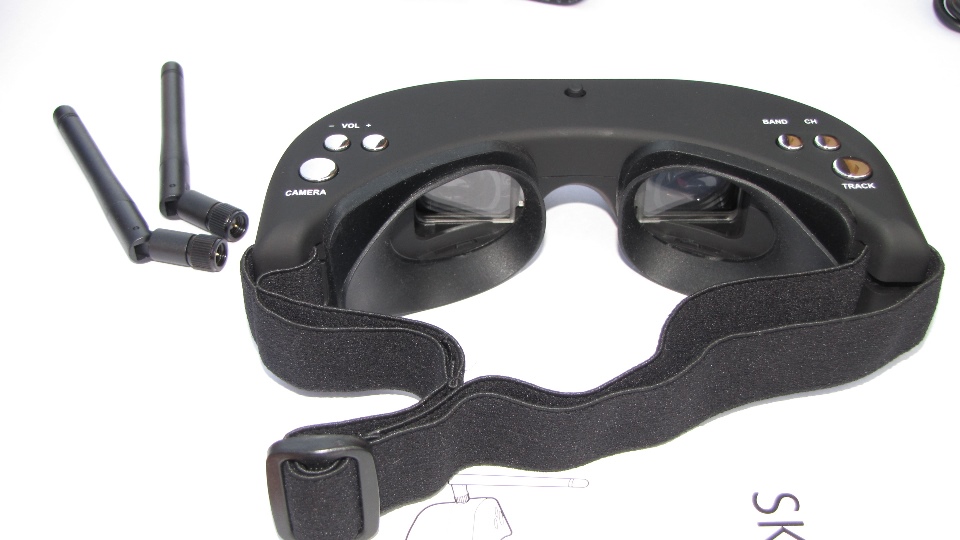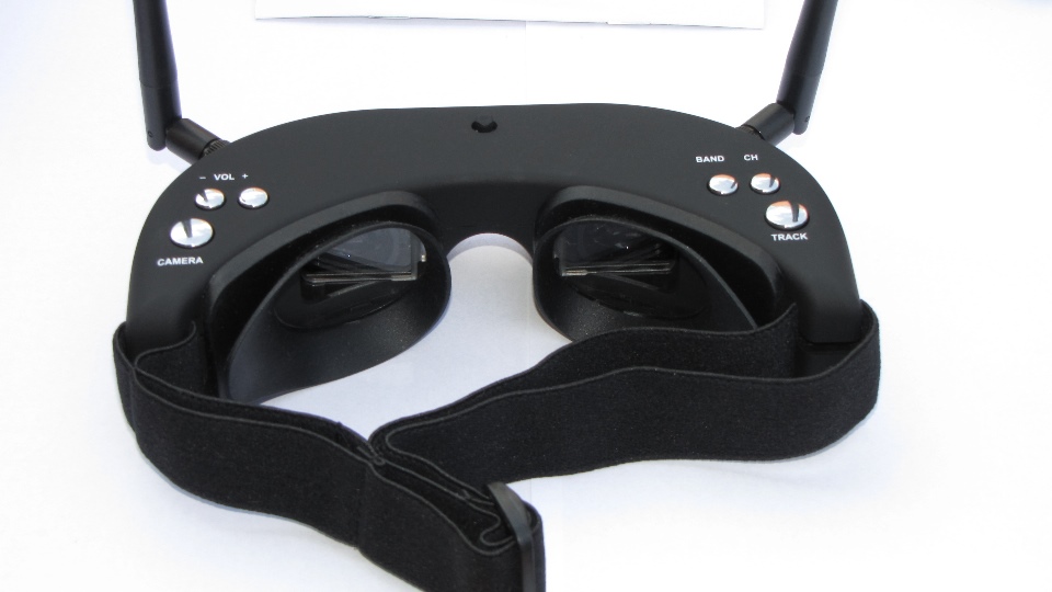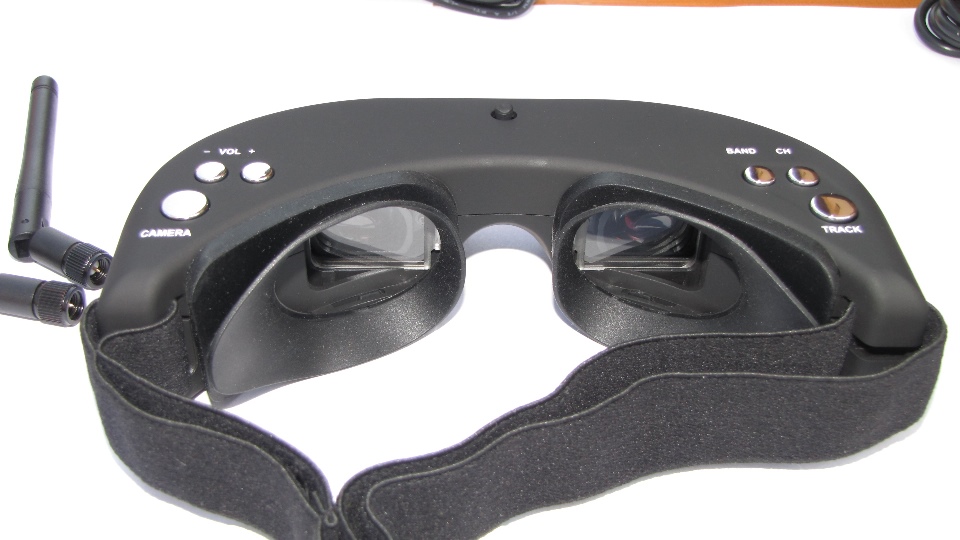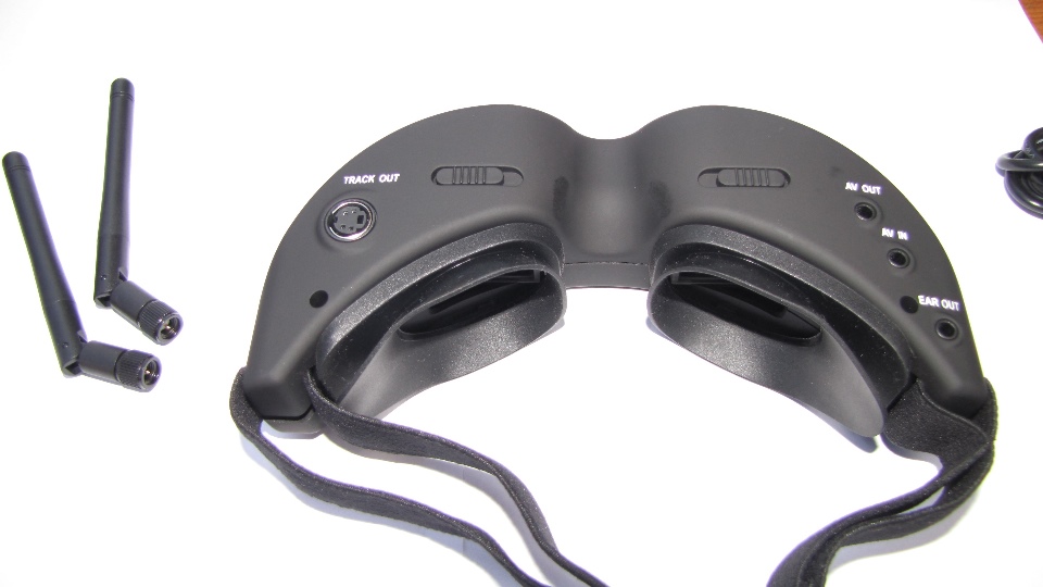 Poniżej zdjęcia goggli. Po wyjęciu z pudełka dokładnie obejrzałem goggle z każdej strony. Nie odniosłem wrażenia iż trzymam odpustową zabawkę, no może poza srebrnymi klawiszami ;) te jednak działają precyzyjnie. Materiał z którego są wykonane sprawia wrażenie solidnego. Z obu stron widzimy gniazda SMA na anteny, które dołączone są w komplecie z innymi akcesoriami. Wbudowany system diversity na 5.8GHz wybiera zawsze najsliniejszy sygnał. Gogle zaraz po włączeniu sygnalizują dzwiękowo tryb pracy w jakim się znajdują (kanał).