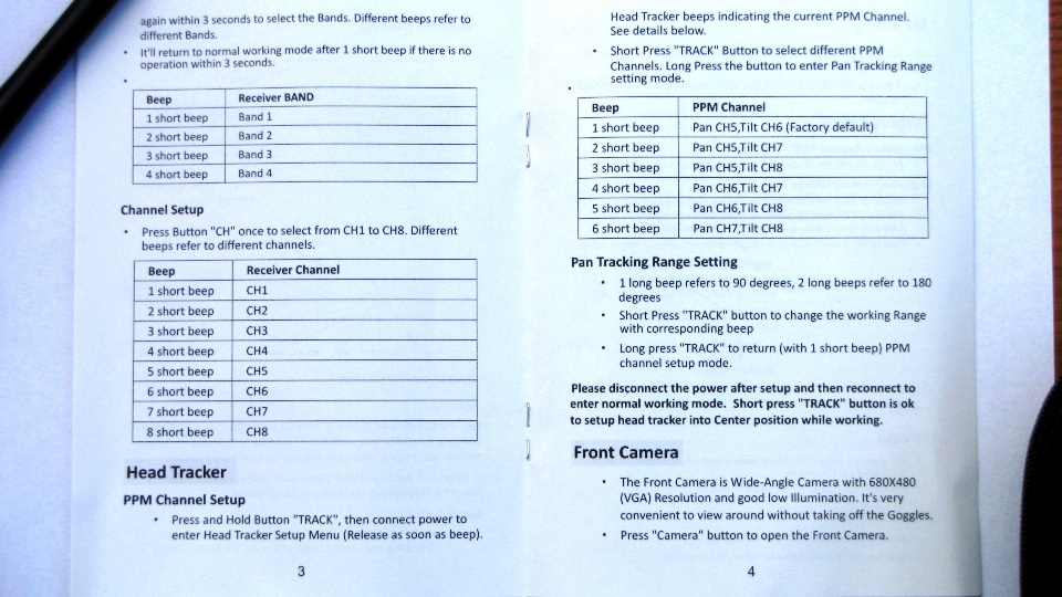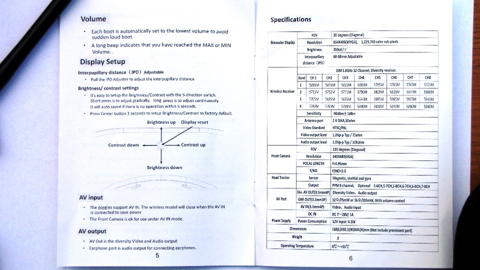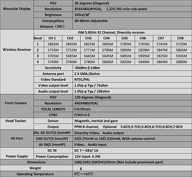 Poniżej tabelki z parametrami technicznymi. Jak widac zakres obsługiwanych przez odbiornik video częstotliwości zapewnia kompatybilność z wszystkimi systemami FPV działającymi w paśmie 5.8GHz. To duży postęp w stosunku do fatsharków które były ograniczone tylko do własnej listy kanałów (przesunięte o około 5MHz w stosunku do innych producentów).