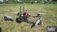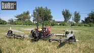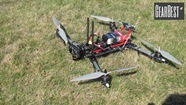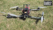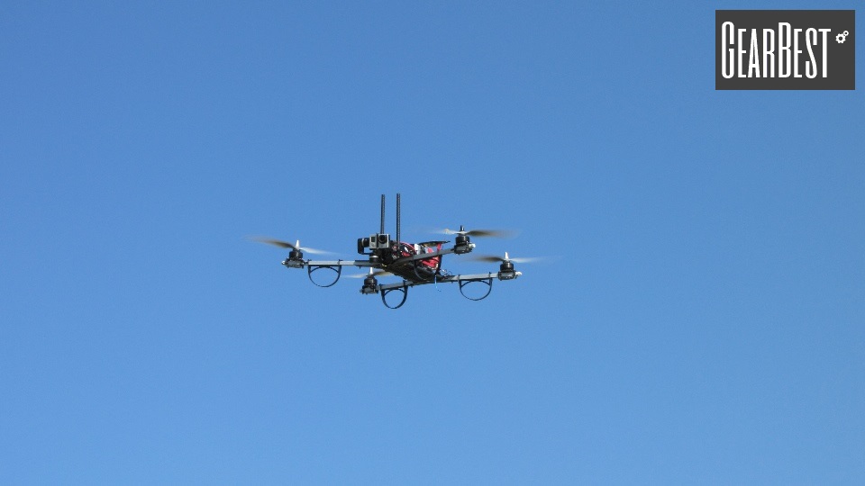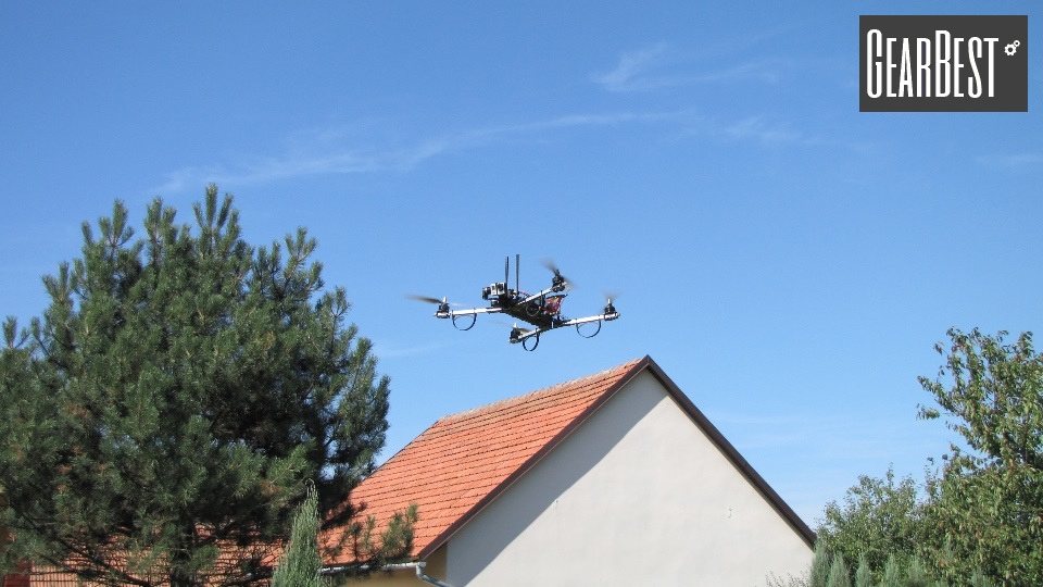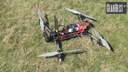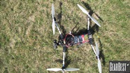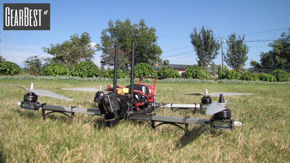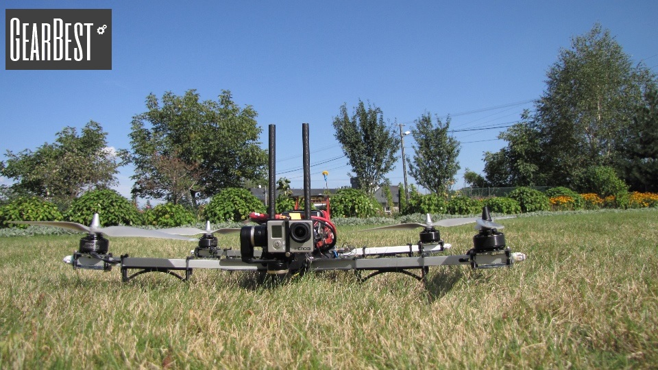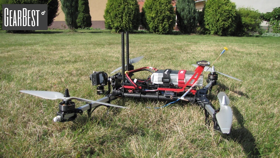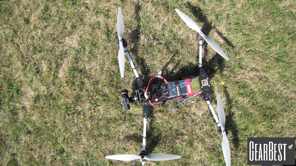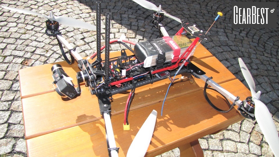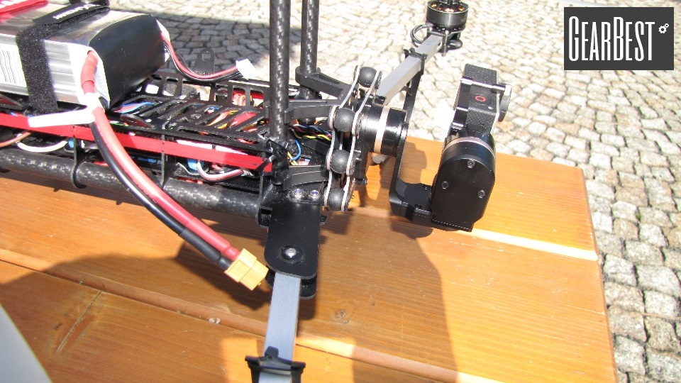 Test gimbala trzymanego w ręce wypadł idealnie, ale każdy gimbal taki test przechodzi. Schody zaczynają się gdy pojawią się wibracje, pęd powietrza - zainstalowałem więc gimbal na pokładzie wielowrinikowca. Standardowa platforma testowa czyli Q7.6 MAX, mój prototyp do testowania osprzętu modelarskiego. Chwila dłubania i gimbal 2D DYS został zdemontowany, w jego miejsce zamontowałem FeiyuTech 3D Mini. Ze względu na to iż jest to test, pozostawiłem długie rurki węglowe, przydadzą się jeszcze w innych projektach. Jak widać na zdjęciach gimbal nie opiera się o podłoże można spokojnie lądować nawet w trawie.