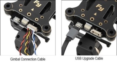 Wygląd panelu z gniazdami do programowania oraz do zasilenia i sterowania gimbalem. To drugie jest wiązką przewodów do której podpinamy zasilanie 2-4S oraz sygnał z trzech kanałów do sterowania gimbalem (możemy nie podpinać żadnego kanału RC)