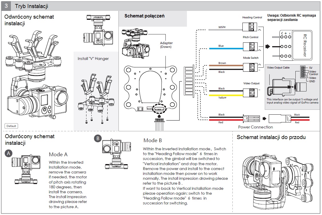 Na dołączonej do zestawu instrukcji obsługi znajdziemy podstawowe parametry pracy gimbala. Należy sie zapoznać z informacjami tam umieszczonymi przed podłączeniem elektroniki do zasilania. Na poniższym rysunku znajduje się wycinek instrukcji, który nas interesuje.